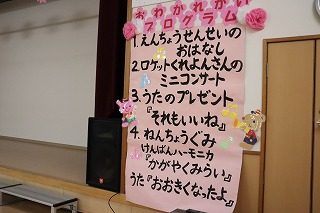 今日は、年長組さんのお別れ会をしました🌸まず初めに、園長先生のお話を聞きいてお別れ会が開催しました! ロケット…