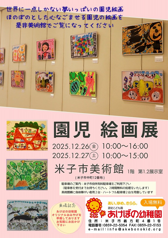 あけぼの編集01 2025年12月2日 あけぼの幼稚園絵画展が 12/26(金)、27(土) 米子市美術館で開催されます🎨 入場無料です園児の世界に一点しかないほのぼのとした絵をご覧にお気軽にお出かけ下さいお待ちしております💕 詳細はこちらをクリックして下さい。ご案内がPDFでご覧いただけます。 ≪ 前の記事