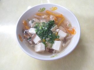 絹ごし豆腐、人参、大根、干し椎茸、ごぼう、油揚げ、ねぎ