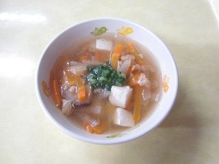 絹ごし豆腐、人参、大根、干し椎茸、ごぼう、油揚げ、ねぎ