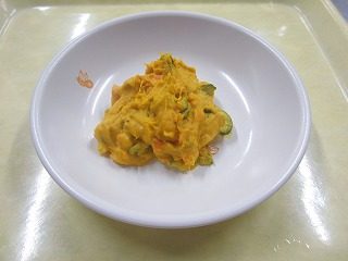 蒸したかぼちゃを軽くつぶし、卵不使用のマヨネーズで和えました。きゅうりや玉ねぎのシャキシャキした食感がクセになるクリーミーなサラダです