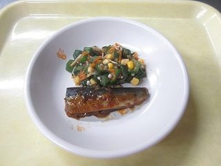 付け合わせのおかか和えは、オクラのねばねば食感とコーンの食感にかつお節の風味やうま味が野菜の旨味をアップし、食欲を増進させます😋