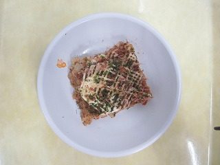 上からお好みソース、ノンエッグマヨネーズ、鰹節、青のりをふりかけて↓