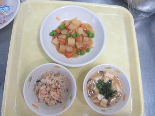 みんな大好き鮭ご飯!鮭は川で生まれ、大人になるまで海で暮らし、卵を産むために生まれた川にまた戻ってくる習性があります。鮭には、たんぱく質や脂質、ミネラルやビタミン類がバランスよく含まれ、特にビタミンDが多いのが特徴です。ビタミンDは、カルシウムと共に丈夫な骨をつくるためには欠かせない栄養素なので、成長期のみなさんには、しっかりとってほしい栄養素のひとつです。