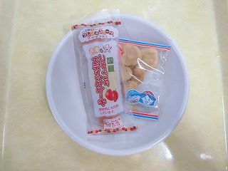 卵・乳・小麦不使用のいちご味のケーキと、可愛らしいハート型のおかきです。