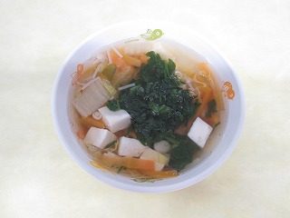 だしのうま味を生かしたすまし汁です!えのきや白菜の自然な甘みが加わり、苦手な野菜も食べやすくなっています!温かい汁物が食事全体を落ち着かせて進める手助けをします!