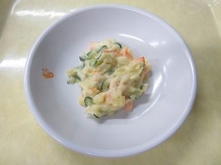 人参の彩りときゅうりのさっぱりとした食感が加わります。ノンエッグマヨネーズを使用し、アレルギーの有無にかかわらず、みんなで同じ物を食べられるサラダです★