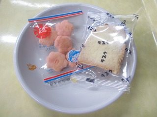 ほんのりピンク色をした、カリッサクッとした食感の可愛らしいせんべいと、クリーム色のシンプルな味のラスクです★