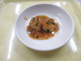 厚揚げは、豆腐を揚げて作られる大豆製品で、たんぱく質を含む食材です。外側はしっかりとした食感がありながら、中はやわらかいのが特徴で、人参やえのきと一緒にあんを作り、厚揚げにかけ、みつばをちらし仕上げています。とろみのあるあんが、厚揚げによく絡み、具材のうま味を感じられる一品です。みつばの香りと彩りがアクセントになり、食欲をそそります☘
