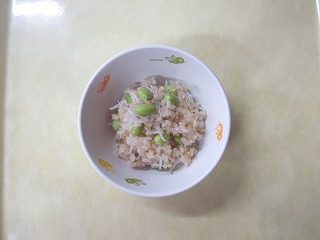 枝豆は大豆の未熟な豆で、たんぱく質を含む食材です。豆類と思われがちですが、実は野菜類に分類されます。野菜と豆の良い所を兼ねそろえた優秀な食材です!ちりめんは、魚から作られる食品で、うま味があり、ご飯によく合います。人参の彩りも加わり、見た目にも明るいご飯になりました。
