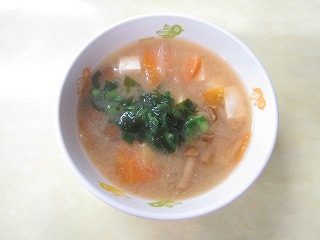 木綿豆腐、人参、玉ねぎ、なめこ、白菜、わかめ、ねぎ