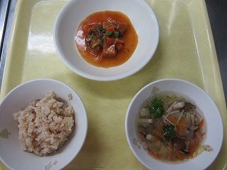 今日の給食は・お赤飯風・清まし汁・赤魚のちゃんちゃん焼・お赤飯風発芽玄米、もち米、塩麹、小豆小豆ごはんにもち米をプラスしたお赤飯…
