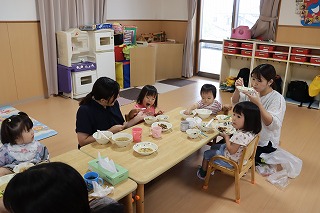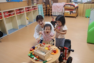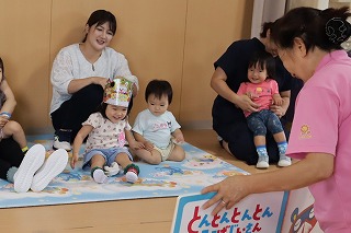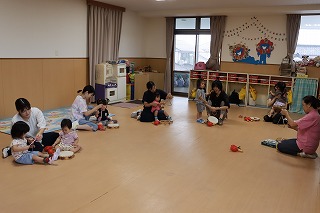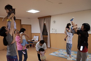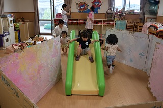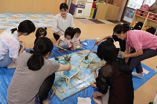 今日のあいあいは、リトッミックの後、ダンボールに大きな筆やローラーを使って豪快にお絵かきをしました