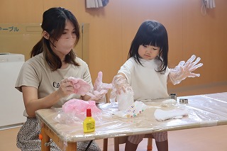 その後、紙粘土に絵の具を混ぜてペン立て作りをしました