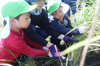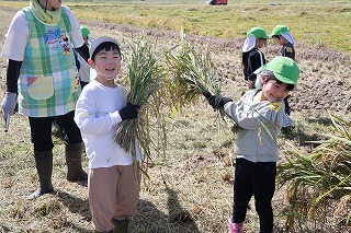 なかなか稲が刈れず、「よいしょ・・・よいしょ・・・」と刈っていき、刈れると「できたー!!」と誇らしげに稲の束を抱えていました。