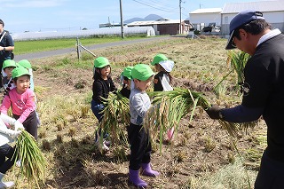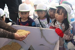 稲を束にしてもらい、コンバインの機械まで持って行き、お米と藁がわかれる所を見させてもらいました。帰る際には、牛舎に行きました。田植えの日に生まれ、年長さんが命名した牛の“あけぼのきららちゃん”の成長を見させてもらいました。「大きくなってる~!」「また来るねー」と声をかけていました。また、お米を乾燥機にかけたり、米袋に入れていく工場の中を見させてもらいました。