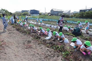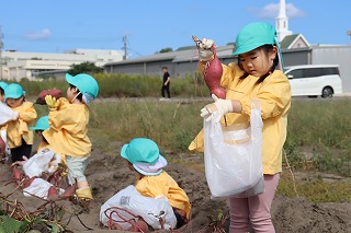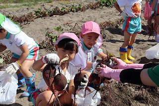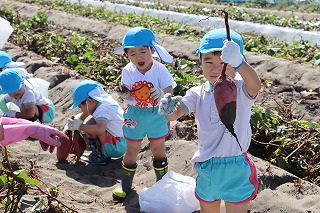 今日は年長・年中・年少・ゆめ組さんが彦名のいも畑にいもほりに行きました![]()