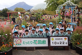 ドームの中を歩き、その先のサルビアの丘で大山をバックに記念写真を撮りましたその後は広い芝生でおにぎり弁当とおやつを食べてスタンプを押して帰りました