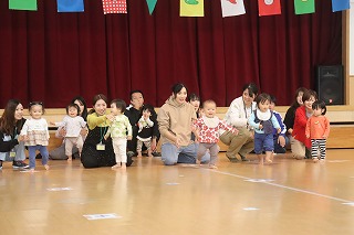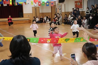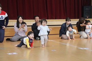 めばえ組のかけっこでは、ハイハイをする子や、『よーい、どん』の笛の合図と共にお父さんやお母さんと一緒に走る子等、みんな頑張りました!
