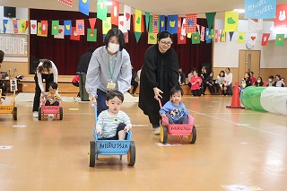 つぼみ組のかけっこでは、ゴールに向かって「頑張れ~~~!!!」 と応援されながら、夢中でゴール地点の保護者の方の元まで走る子ども達でした!走る前の返事も「はい」と言ったり、上手に”ようい”のポーズができました!練習の成果が出ていましたね♪