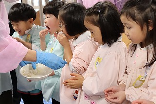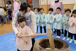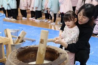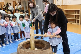 あけぼの 投稿者04 2025年12月17日 今日は、全園児でもちつきをしました!とっても楽しみにしていた子ども達🎶 お餅をつく前に、もち米の香りを嗅ぎ、味見もしました😋 「これがおもちになるのかな?」と不思議そうにしていました。 もちつきが始まると「よいしょ!よいしょ!」と元気の良いかけ声と共に、杵を持って一生懸命に、お餅をつく姿がありました‼️頑張ってついたもち米は、美味しいお餅に大変身✨お友だちと一緒に「おいしいね😋」と食べていました☺️ ≪ 前の記事