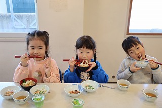 昼食はきつねうどん・からあげ風・サラダ・青りんごゼリーといつもの給食と違い「美味しいね!」「おかわり食べたい!」とみんなで美味しく食べました✨